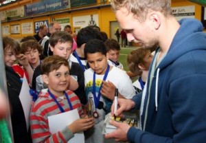 So warteten die 9./10. Klassen bereits auf ihren Einsatz, während die Schüler der 5./6. und 7./8. Klassen noch ihre Urkunden von Dynamoprofi Toni Leistner entgegen nahmen. Wie seine Teamkollegen Sascha Pfeffer und Marcel Franke bei der Siegerehrung der Ältesten, schrieb Leistner nach der Siegerehrung noch einige Zeit fleißig Autogramme. Er habe in seiner Schulzeit auch häufig mit seiner Schulmannschaft an Turnieren wie dem Schneider + Partner Cup teilgenommen. „Beibt dran“, riet er allen Finalisten, „dann wird das auch was.“